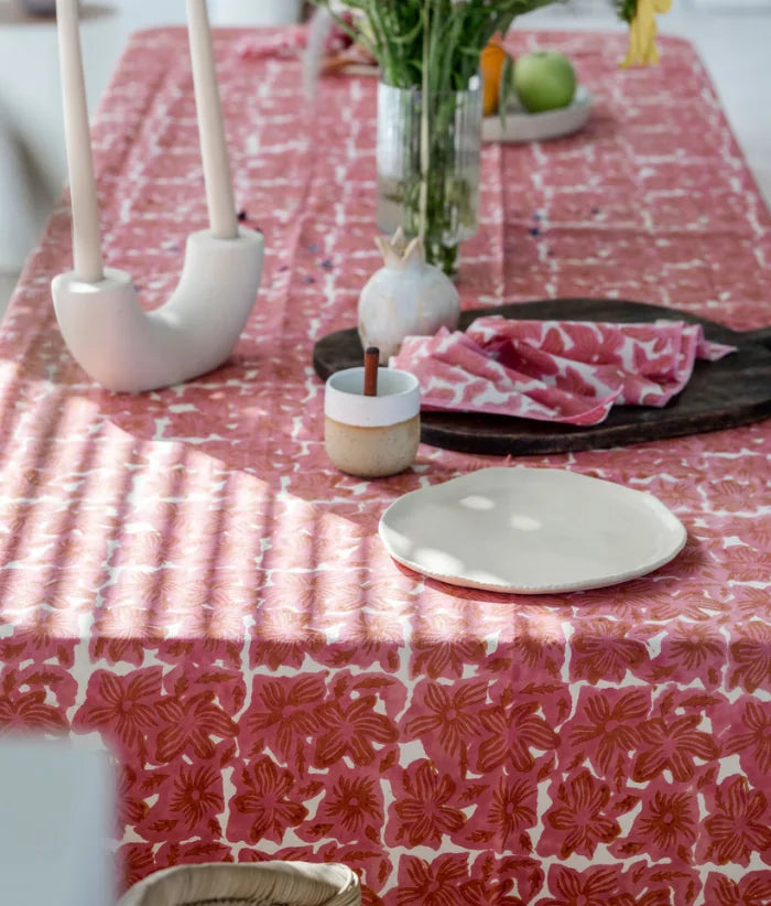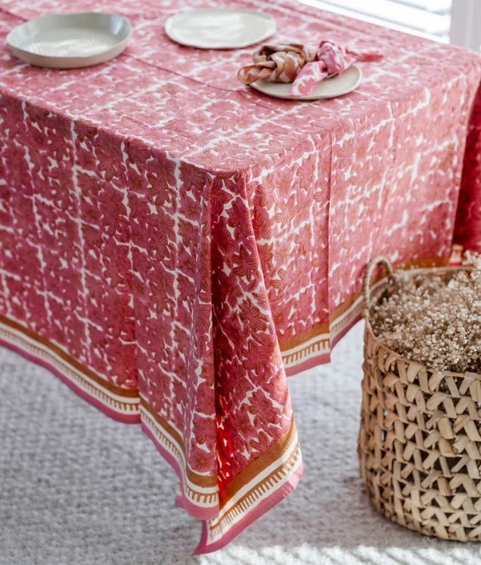 A pretty woodblock-printed tablecloth for a colourful, festive, bohemian table! Complete this pretty table with matching napkins for added chic. We love the wide coloured border for a unique style!